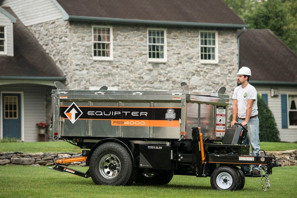 The Equipter RB4000 is a self-propelled roofing trailer that replaces lots of tarps, plywood, and manual labor with a hydraulics-powered container that lifts up to 12 feet high. Crews can drop shingles, old nails, and other debris directly into it, instead of throwing it to the ground. When the container is full, use the RB4000 lift's gas-powered engine to drive it to a dumpster or truck for dumping.